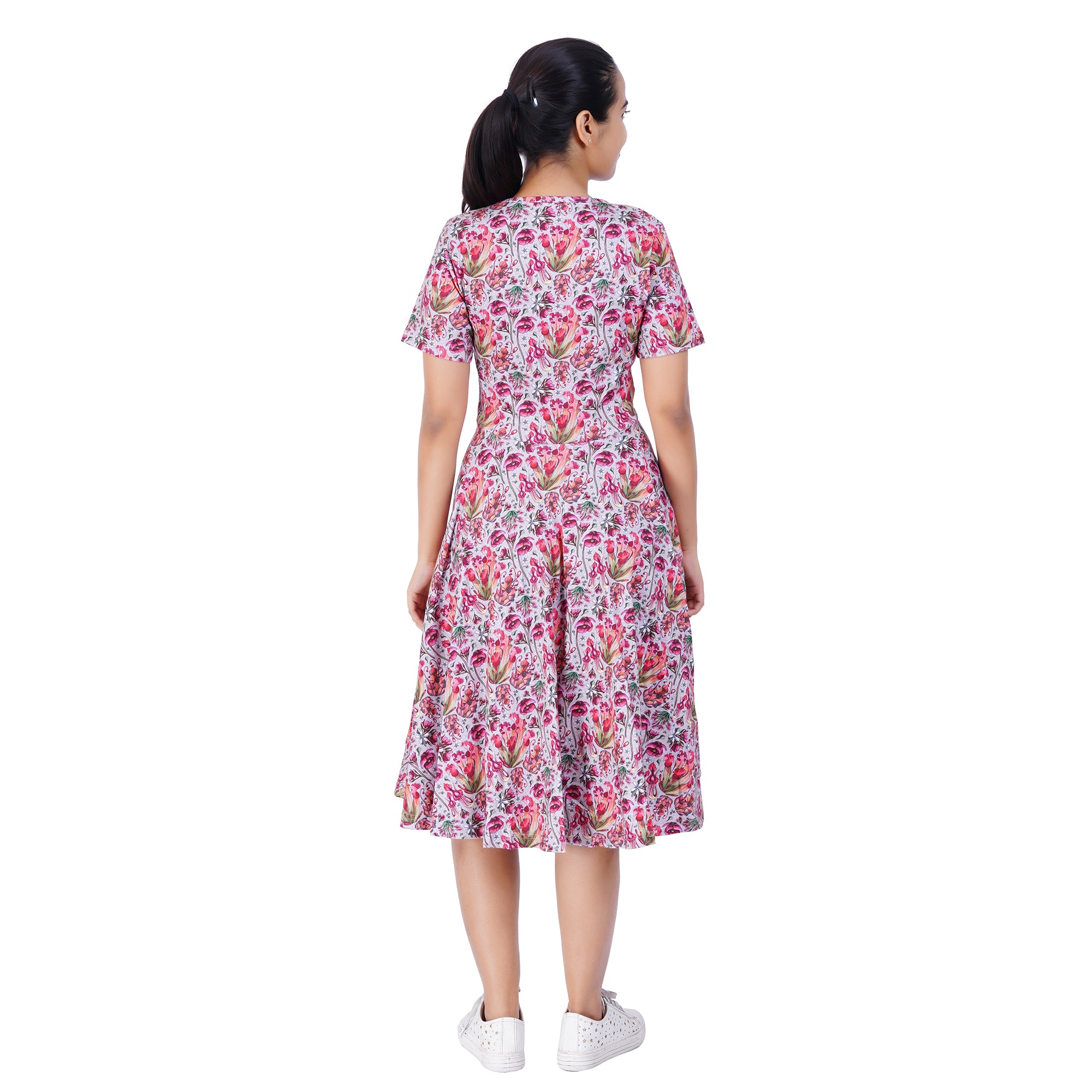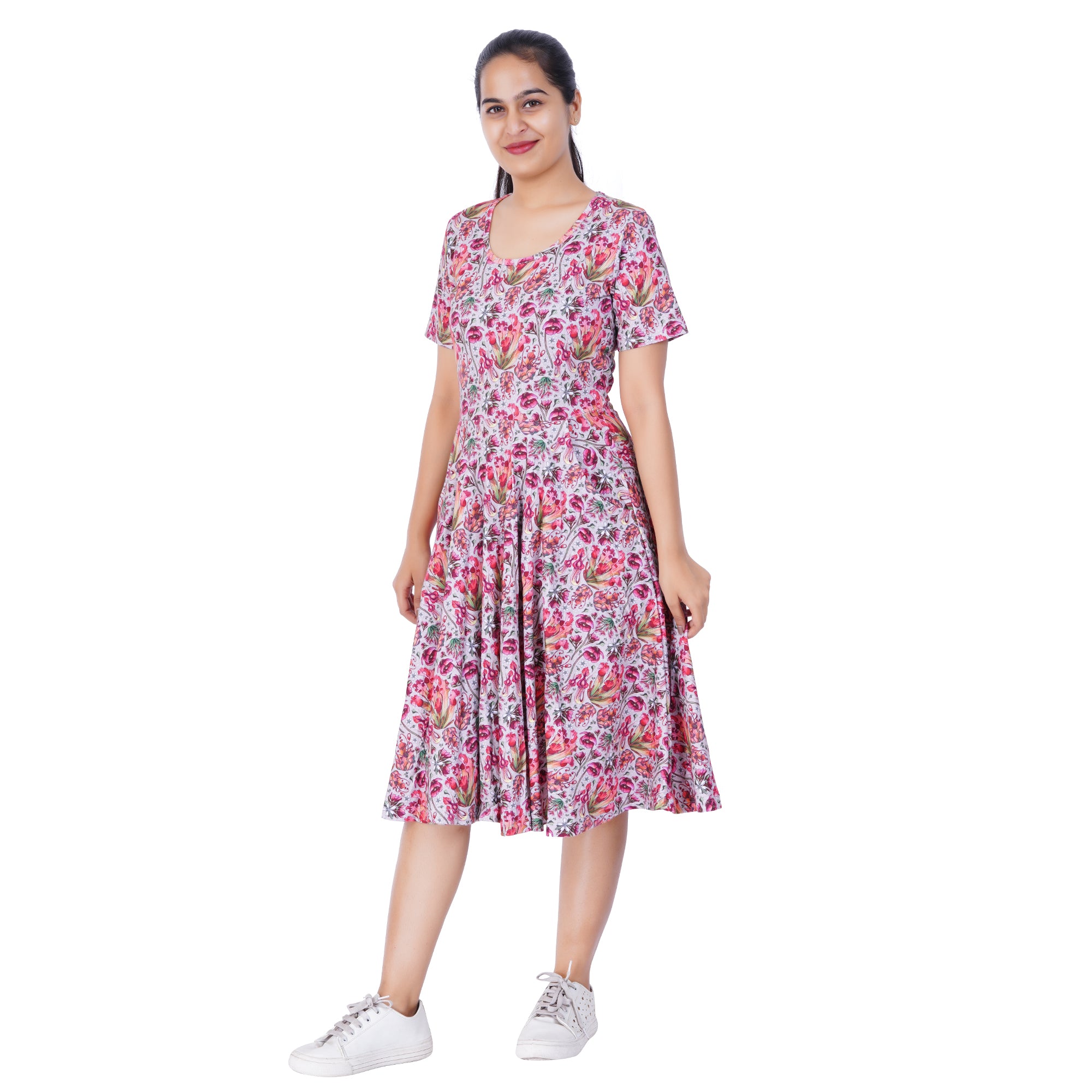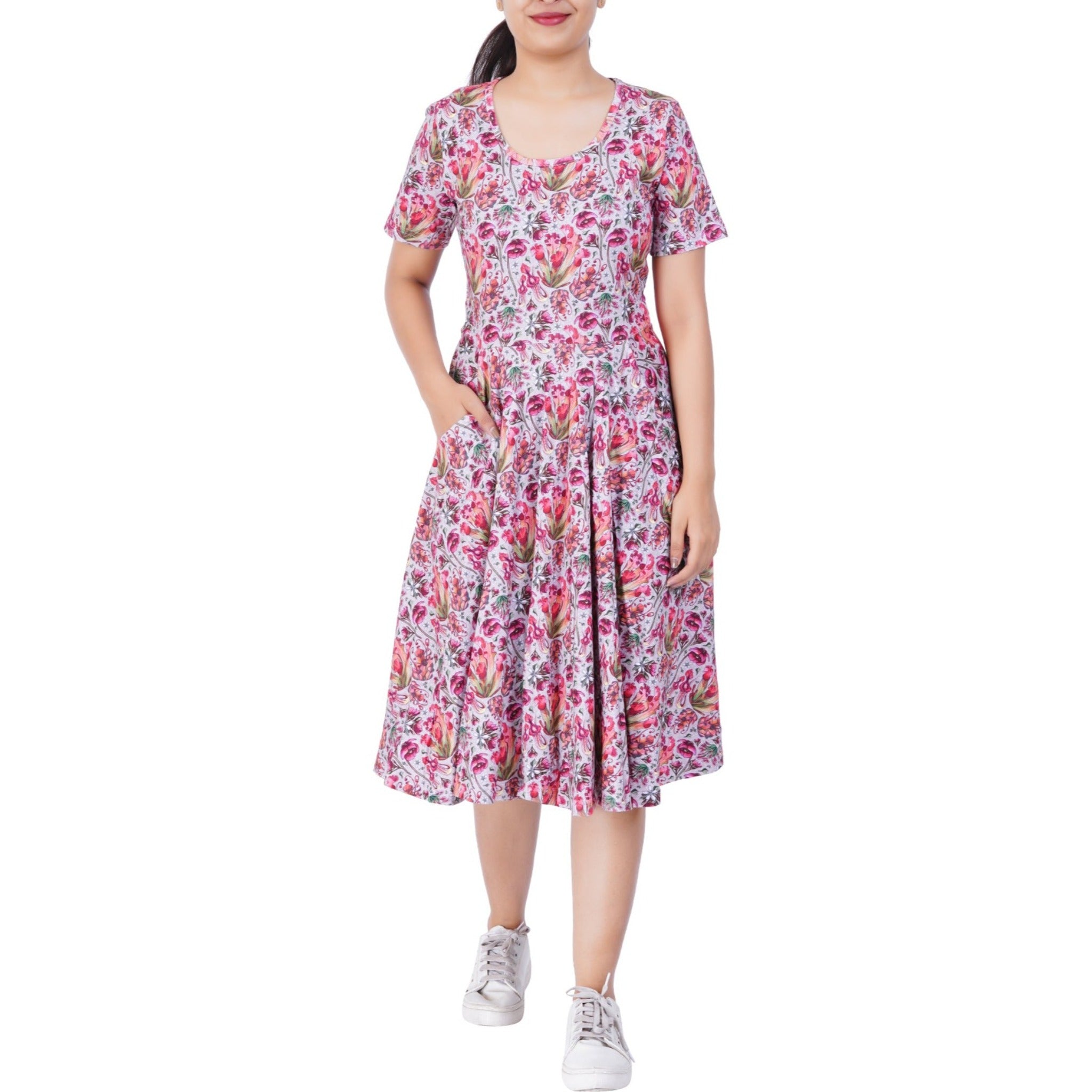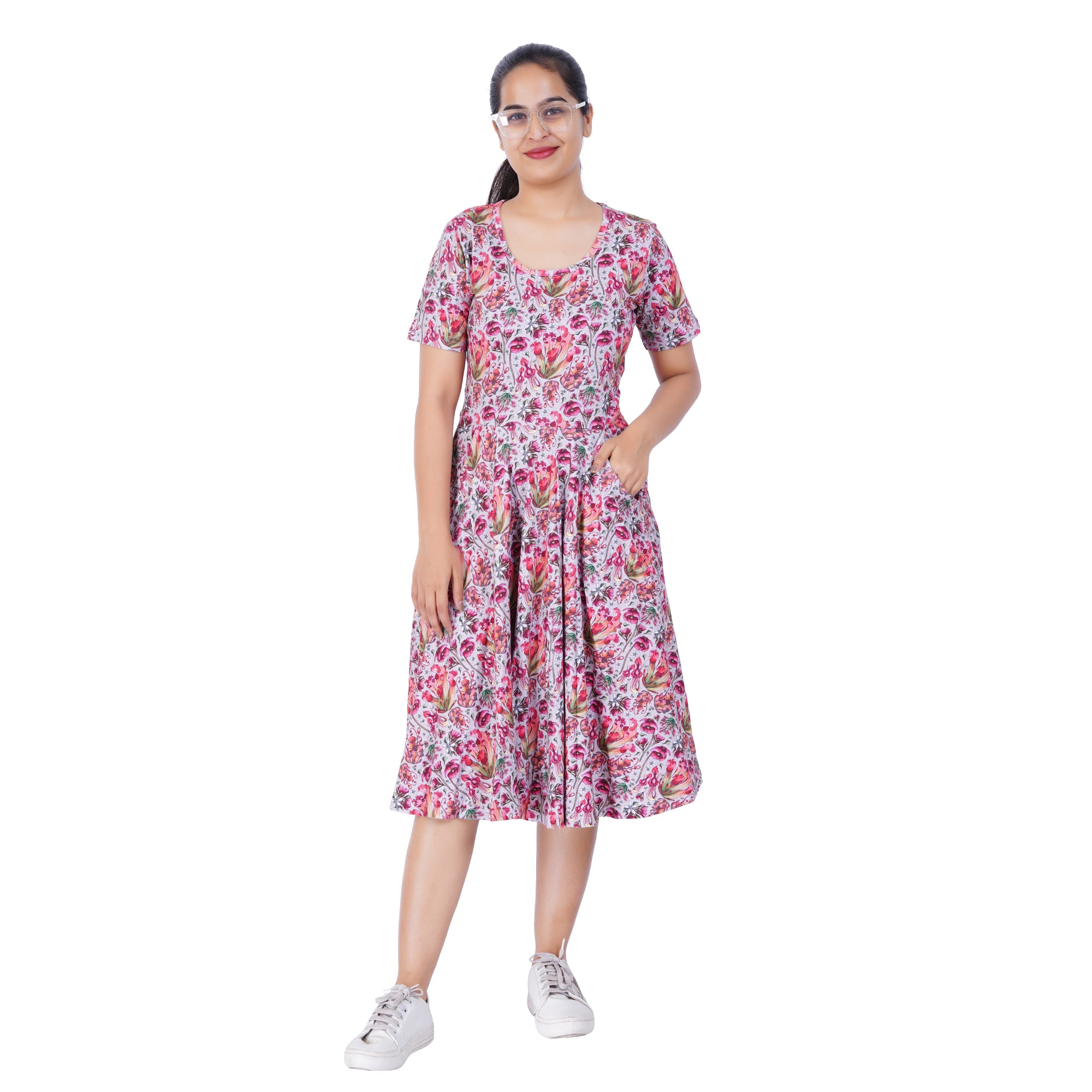 - Short sleeves, scoop neck, 3/4th circle skirt adult dress with pockets