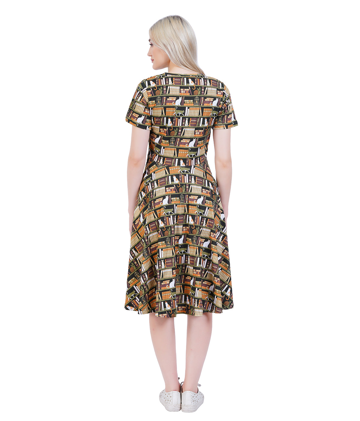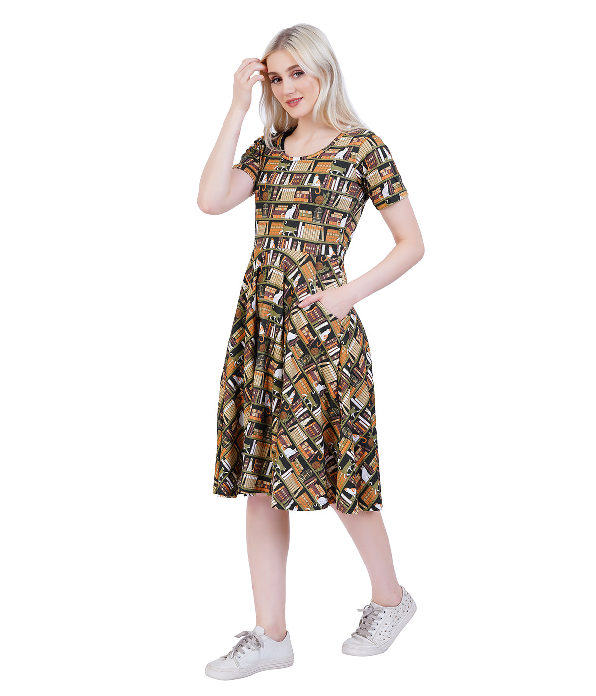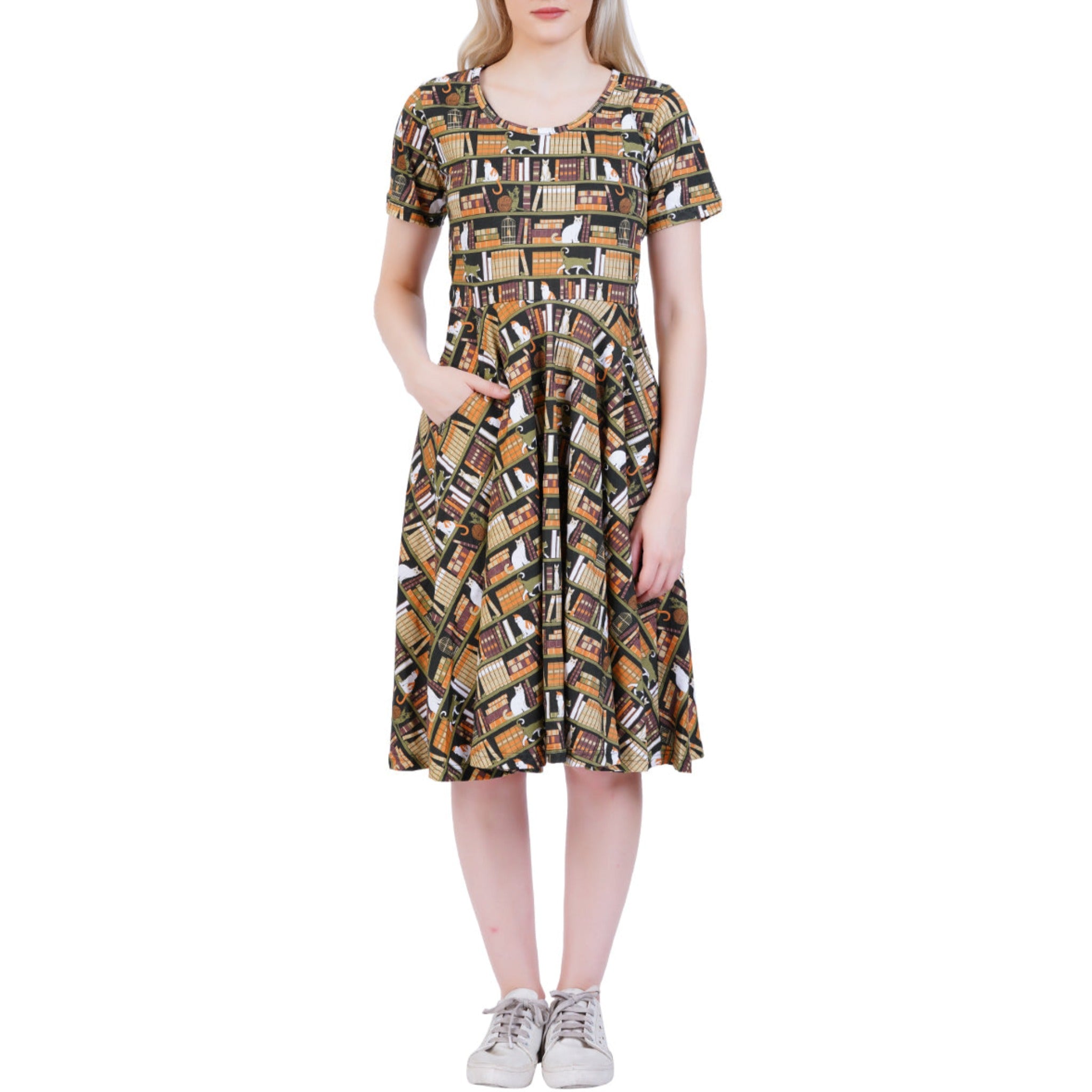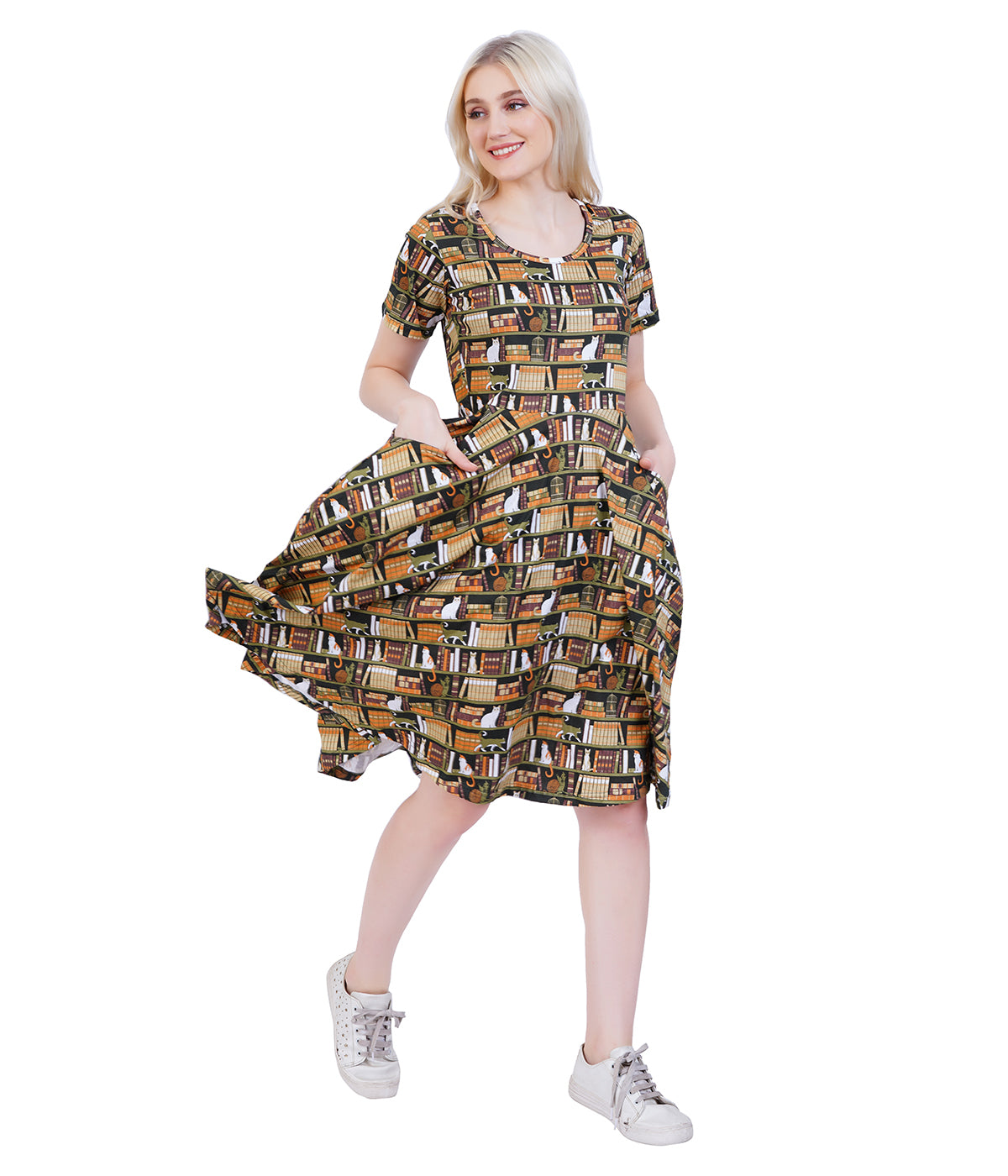- Short-sleeve, scoop-neck, 3/4th circle twirl adult dress with pockets