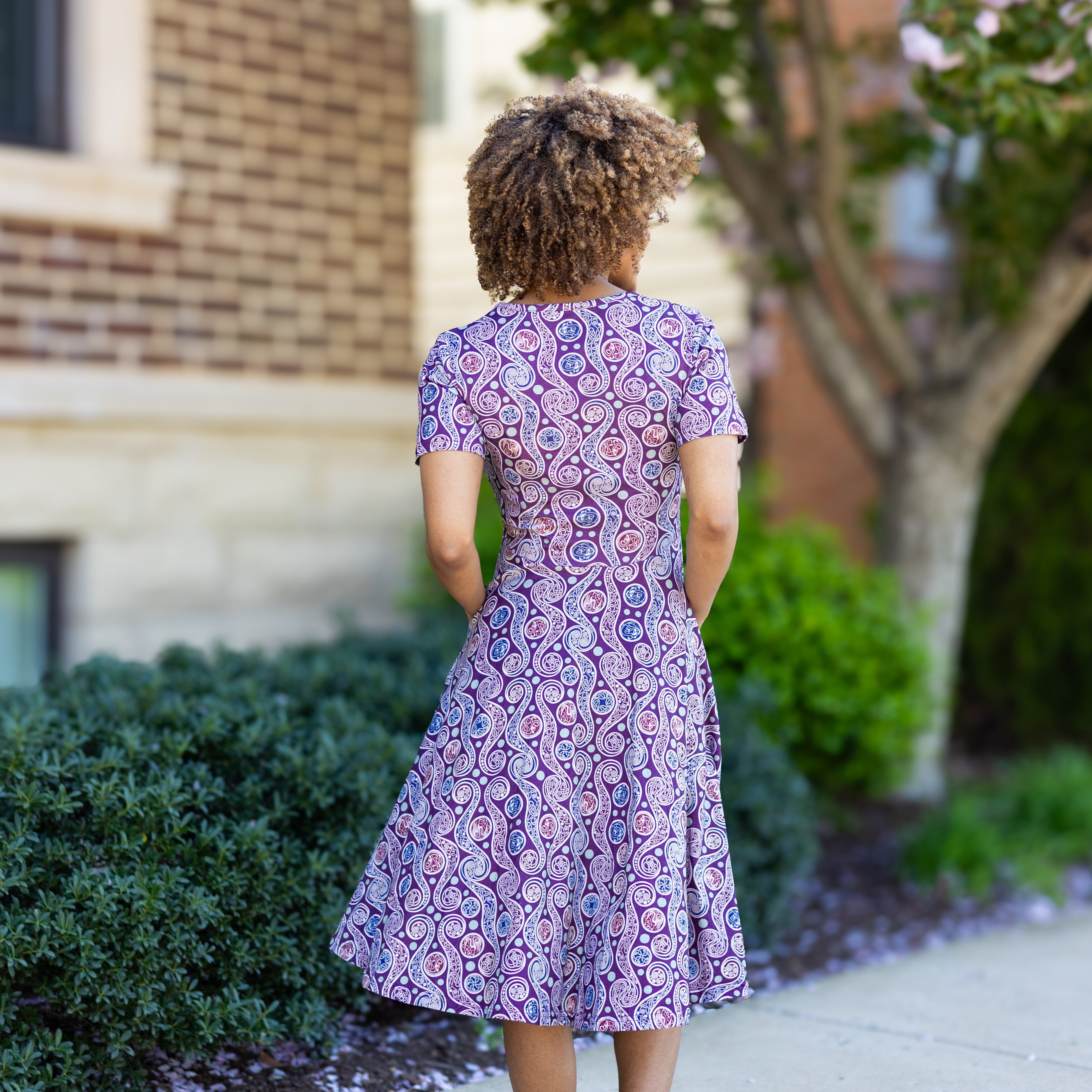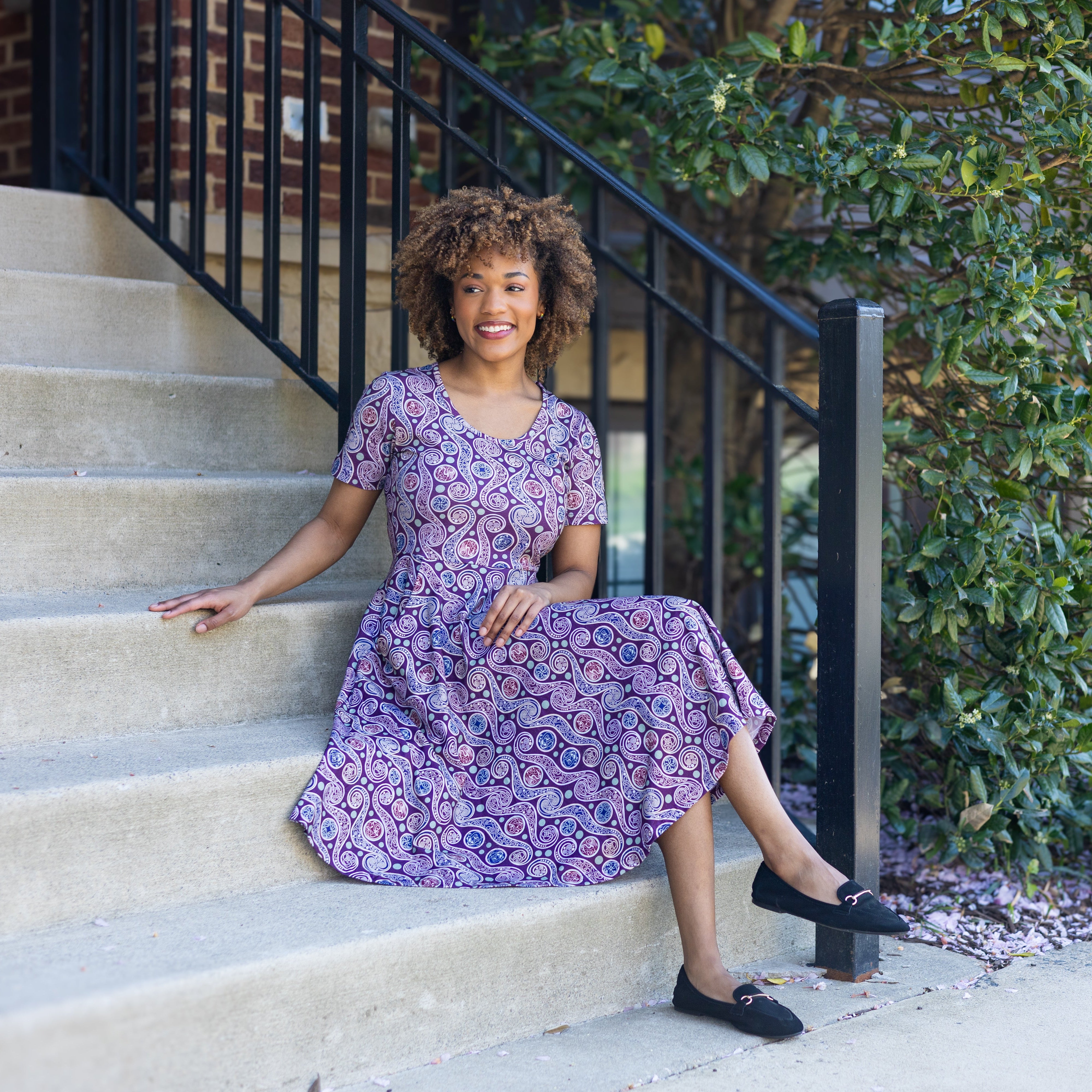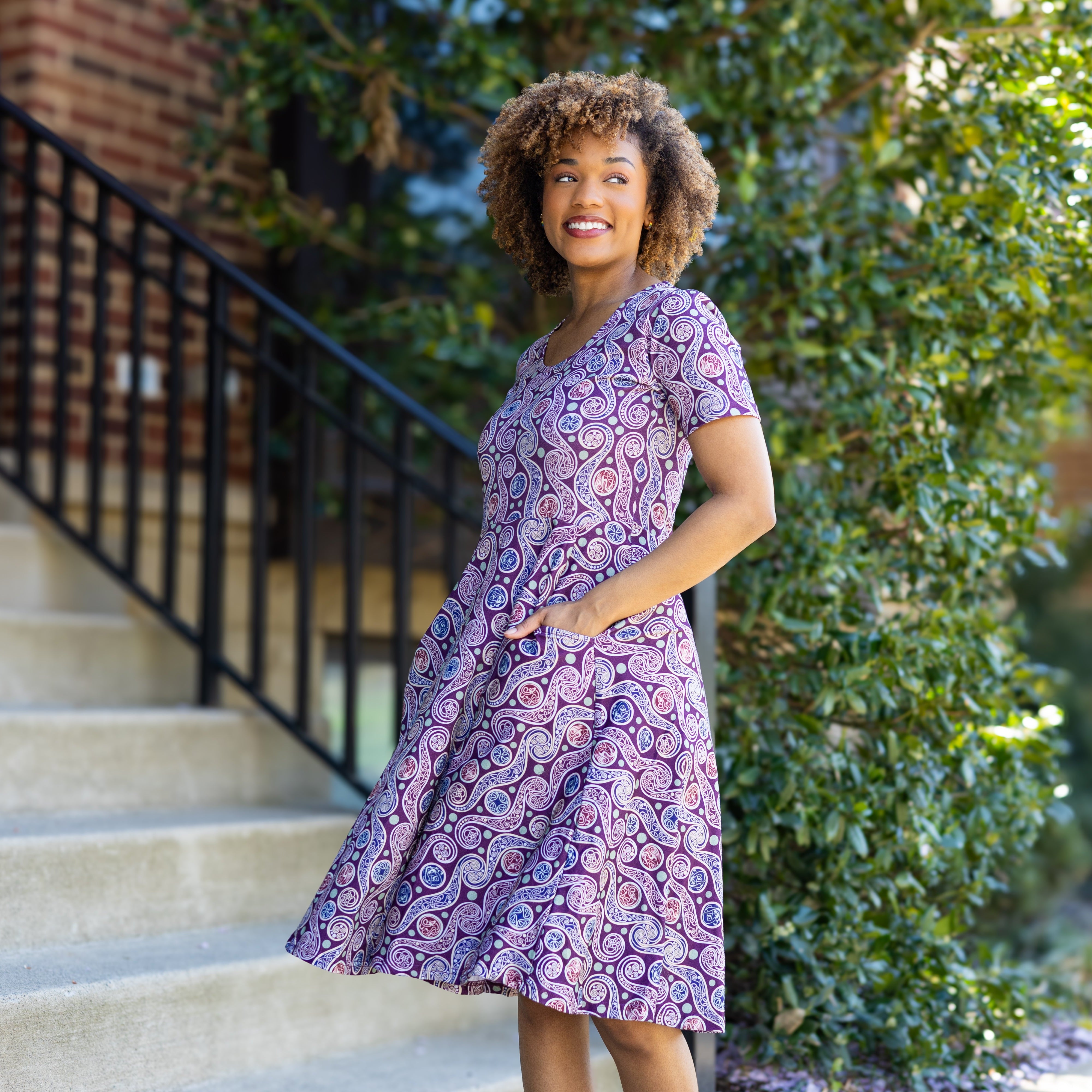 - Short sleeves, scoop neck, 3/4th circle twirl adult dress with pockets