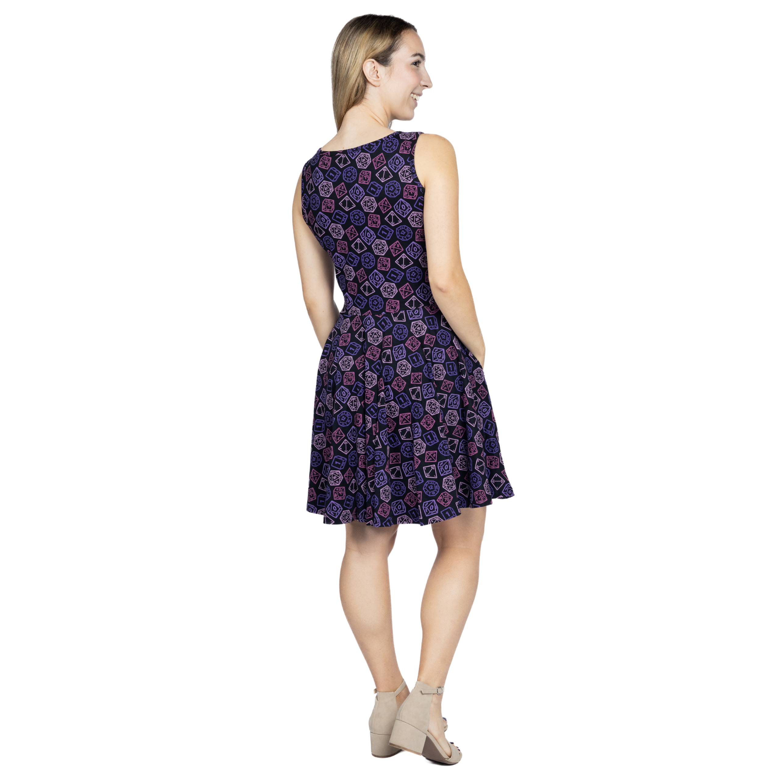 The dress is adorned with an eye-catching pattern of various dice designs, from classic six-sided dice to colorful polyhedral shapes. Perfect for the game-loving fashionista, it is a surefire way to add some luck and levity to your wardrobe. This dress is sure to be a critical hit- buy yours before it rolls away!