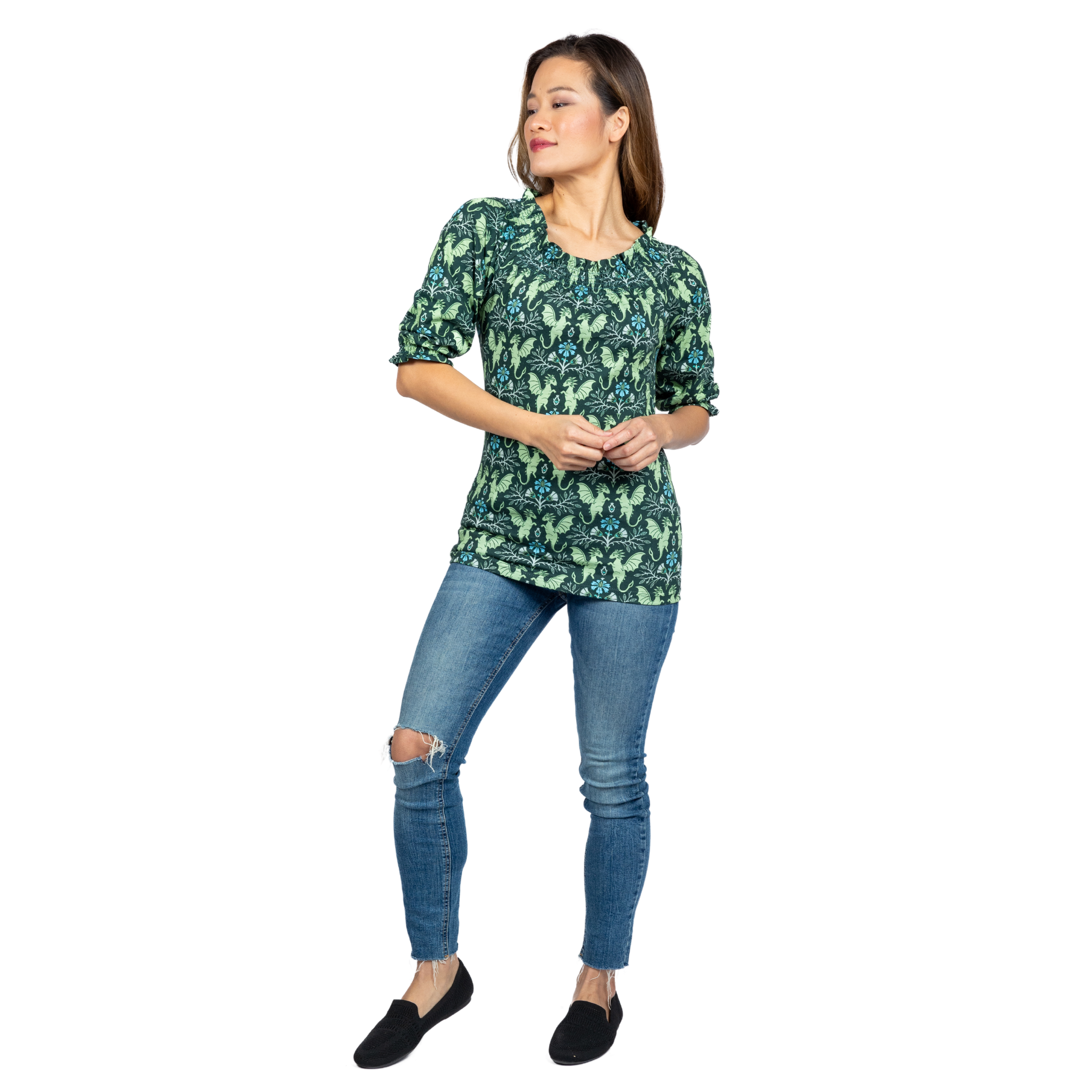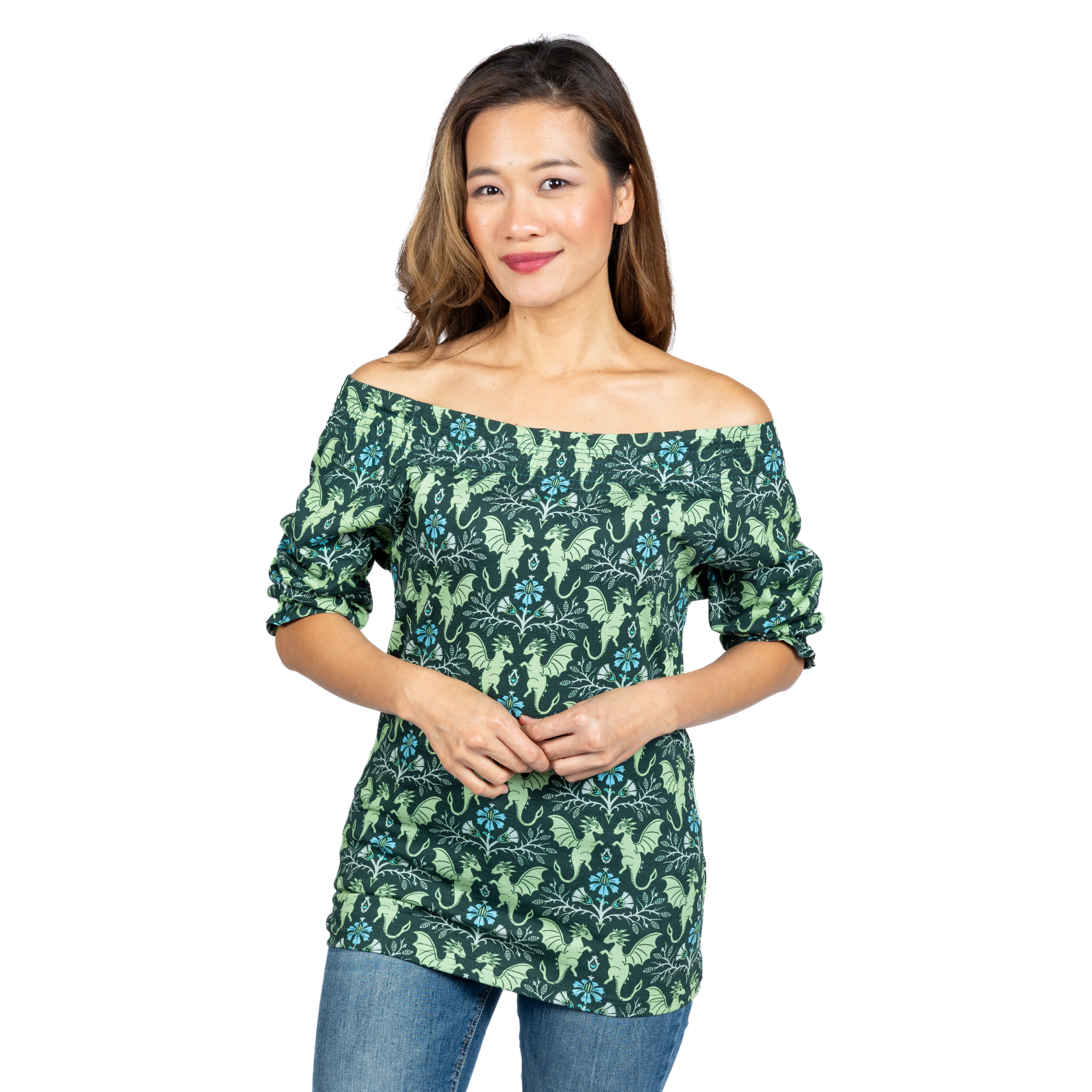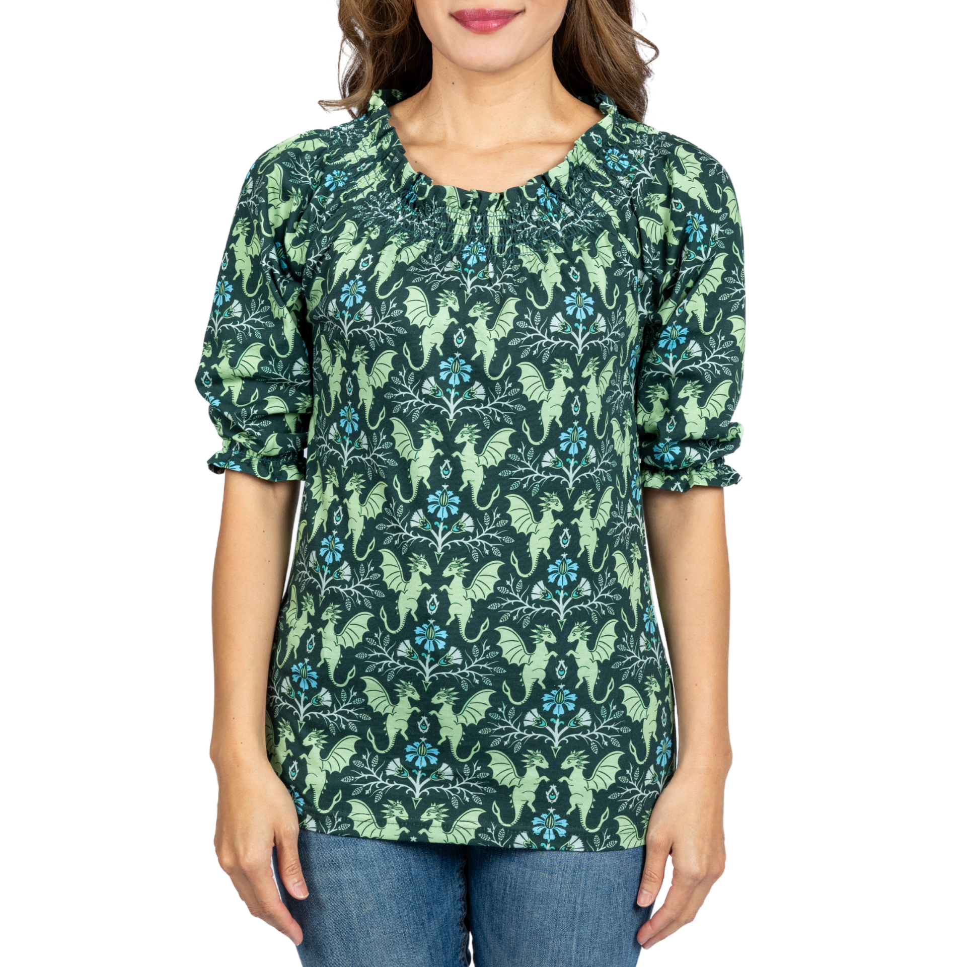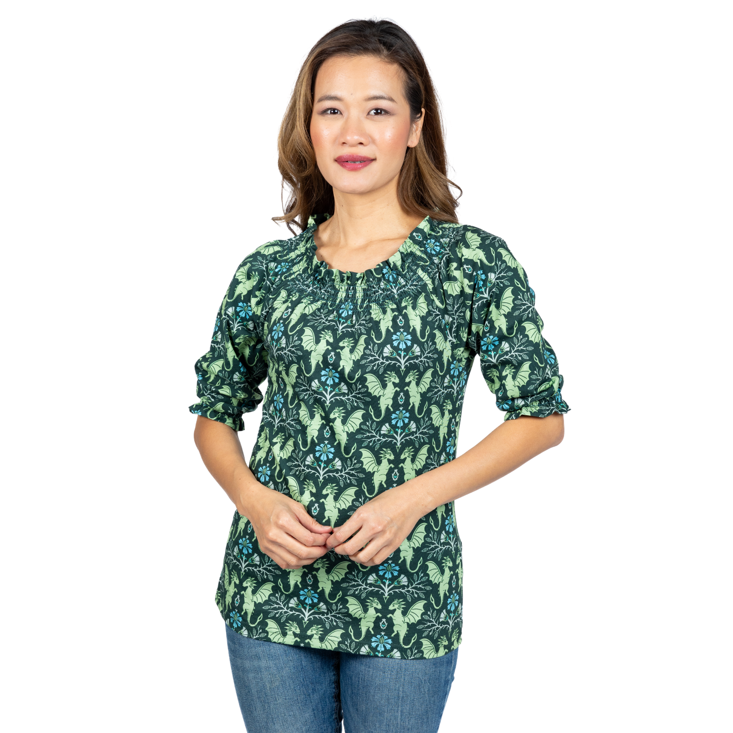 Crafted with exquisite attention to detail, this dress features a stunning damask print adorned with intricate dragon motifs, weaving a tale of power and grace with every thread. From fiery dragons soaring across the fabric to delicate damask patterns, each element is a testament to the magic of storytelling and the allure of the unknown. Embrace your inner dragon tamer and unleash your fierce yet elegant side as you glide through the day in our luxurious top!