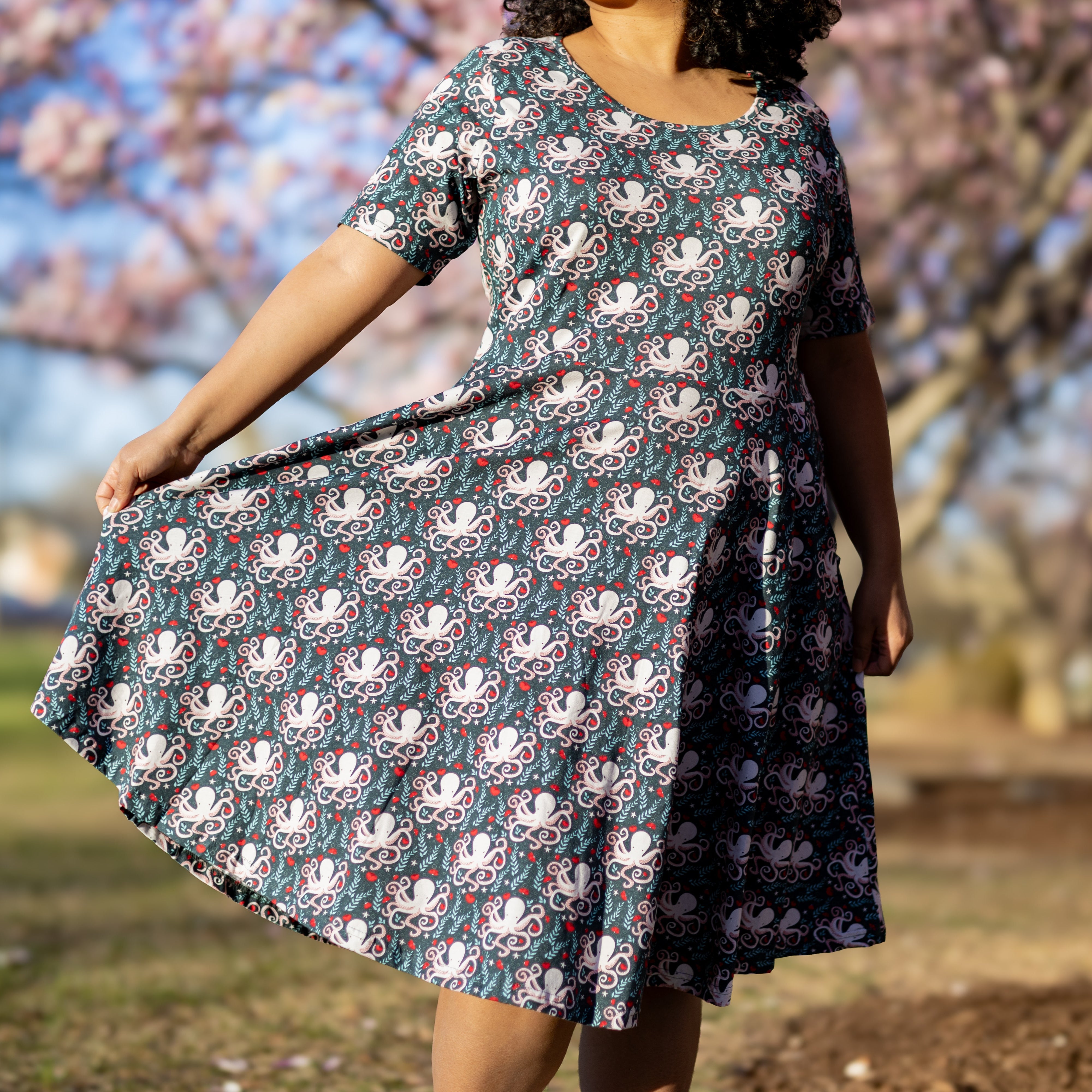 Introducing the mesmerizing Floral Octopus design, a captivating fusion of nature and the mystical sea. This enchanting artwork features a gracefully entwined octopus adorned with intricate floral patterns, showcasing the delicate beauty of underwater life intertwined with the vibrant allure of blooming flowers. Dive into a world where the wonders of the sea and the elegance of florals unite in this truly unique and visually stunning dress!