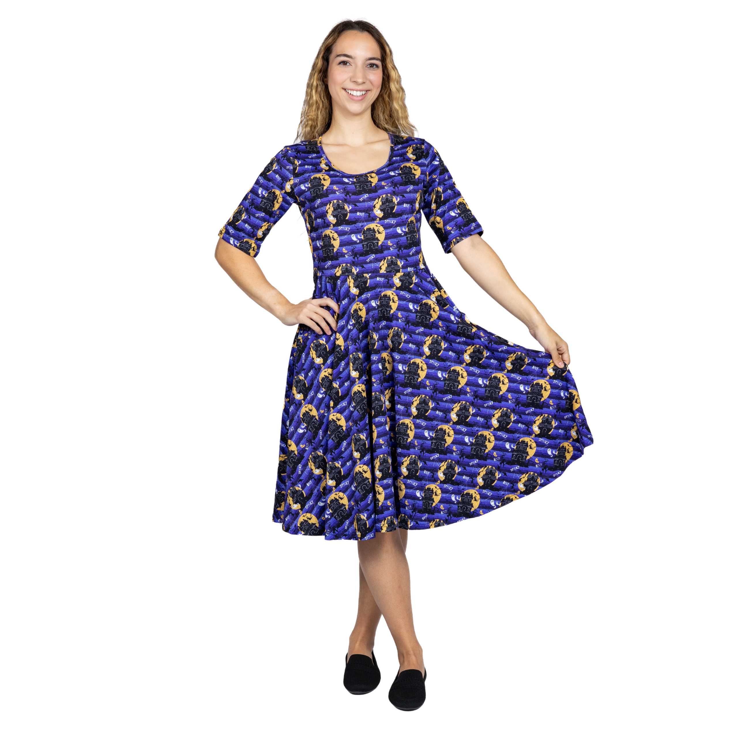 - Elbow-sleeve, round neck, 3/4th circle twirl adult dress with pockets