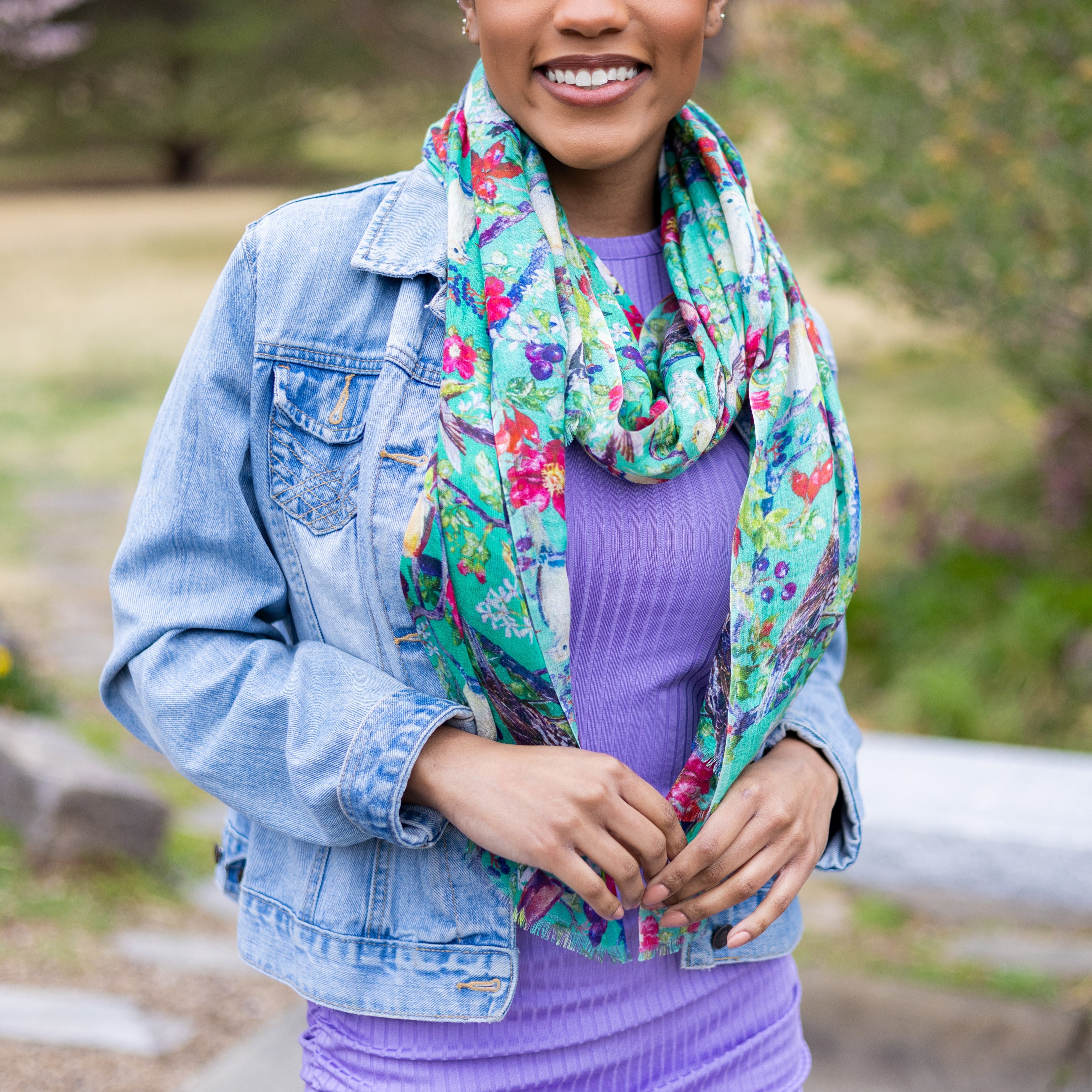 When you think of hen, you may think of chickens, but "hen" can also refer to the various female bird species. This beautifully crafted scarf showcases a flock of female birds, from a hummingbird to a cardinal, celebrating their role as nature’s true nest-builders and trailblazers. It’s a blooming march of winged wonder, where every hen is ready to impress the nest with their peck-tacular energy and grace!