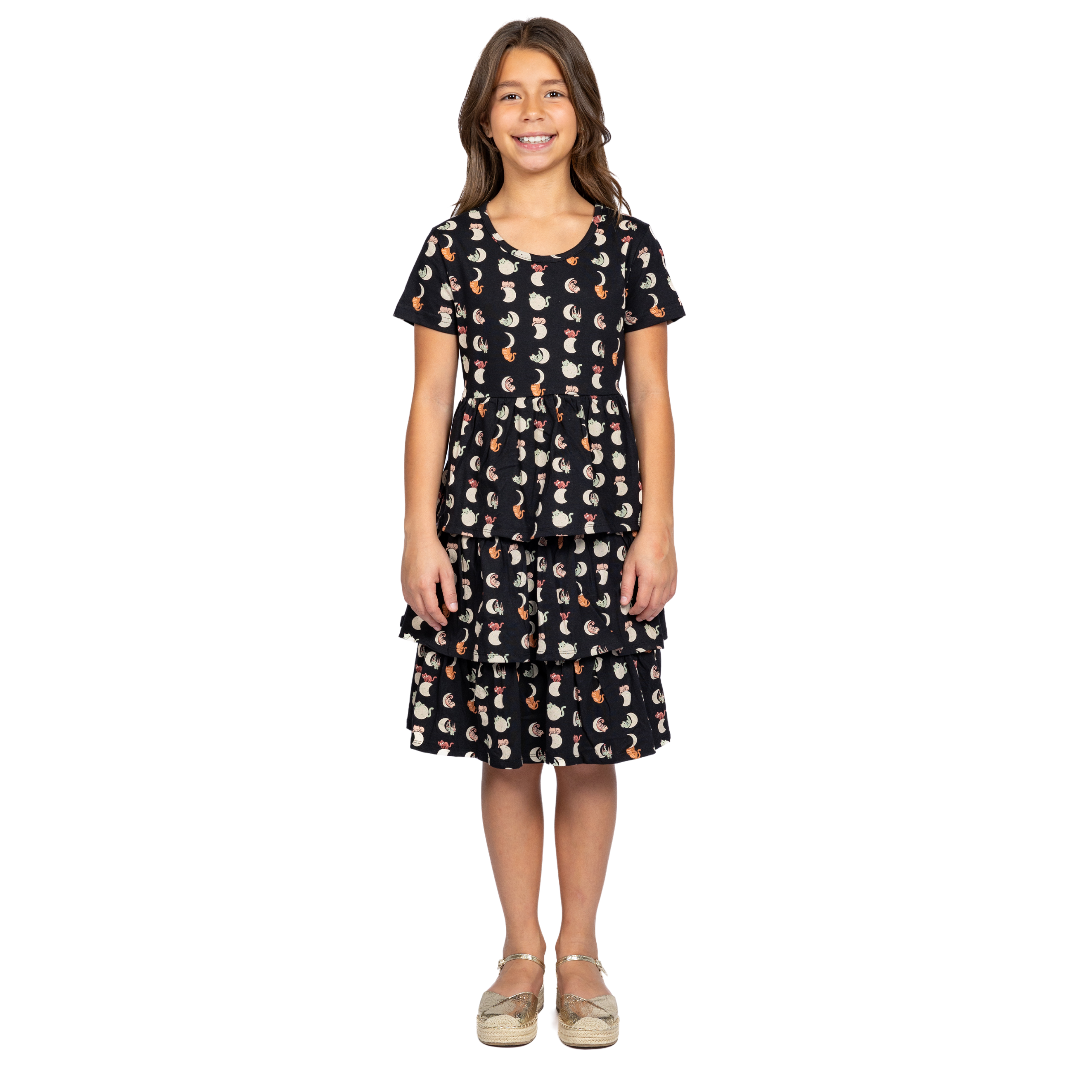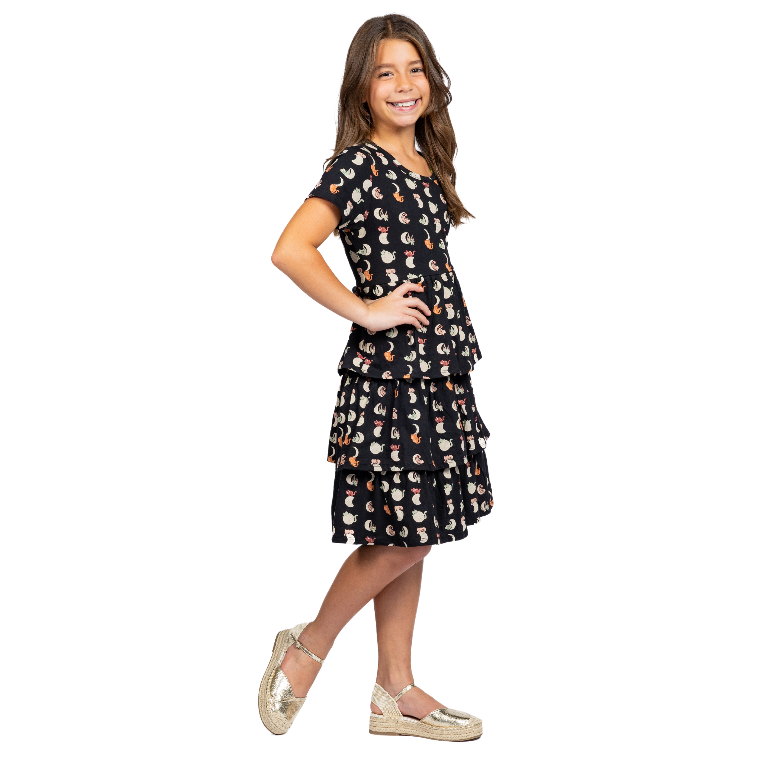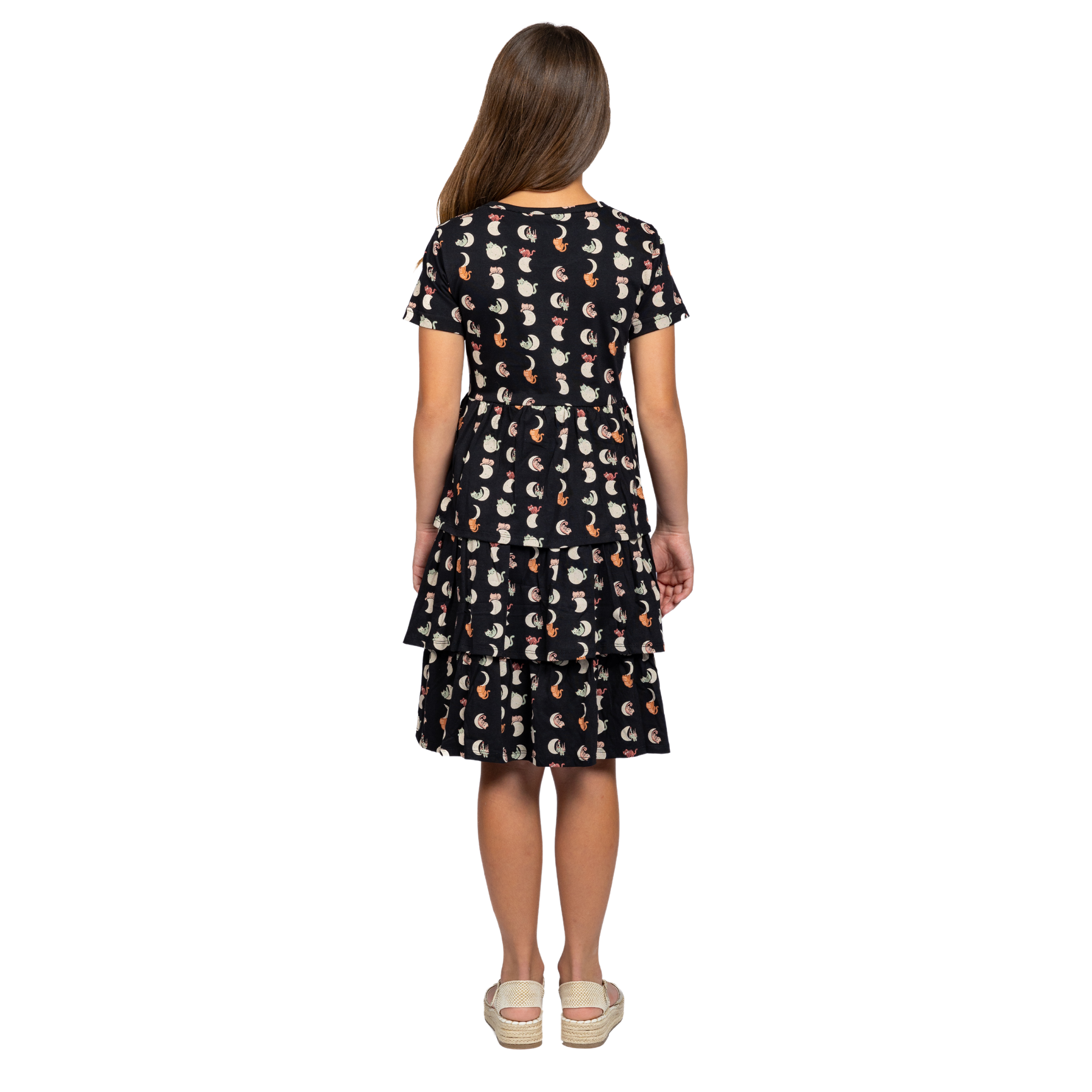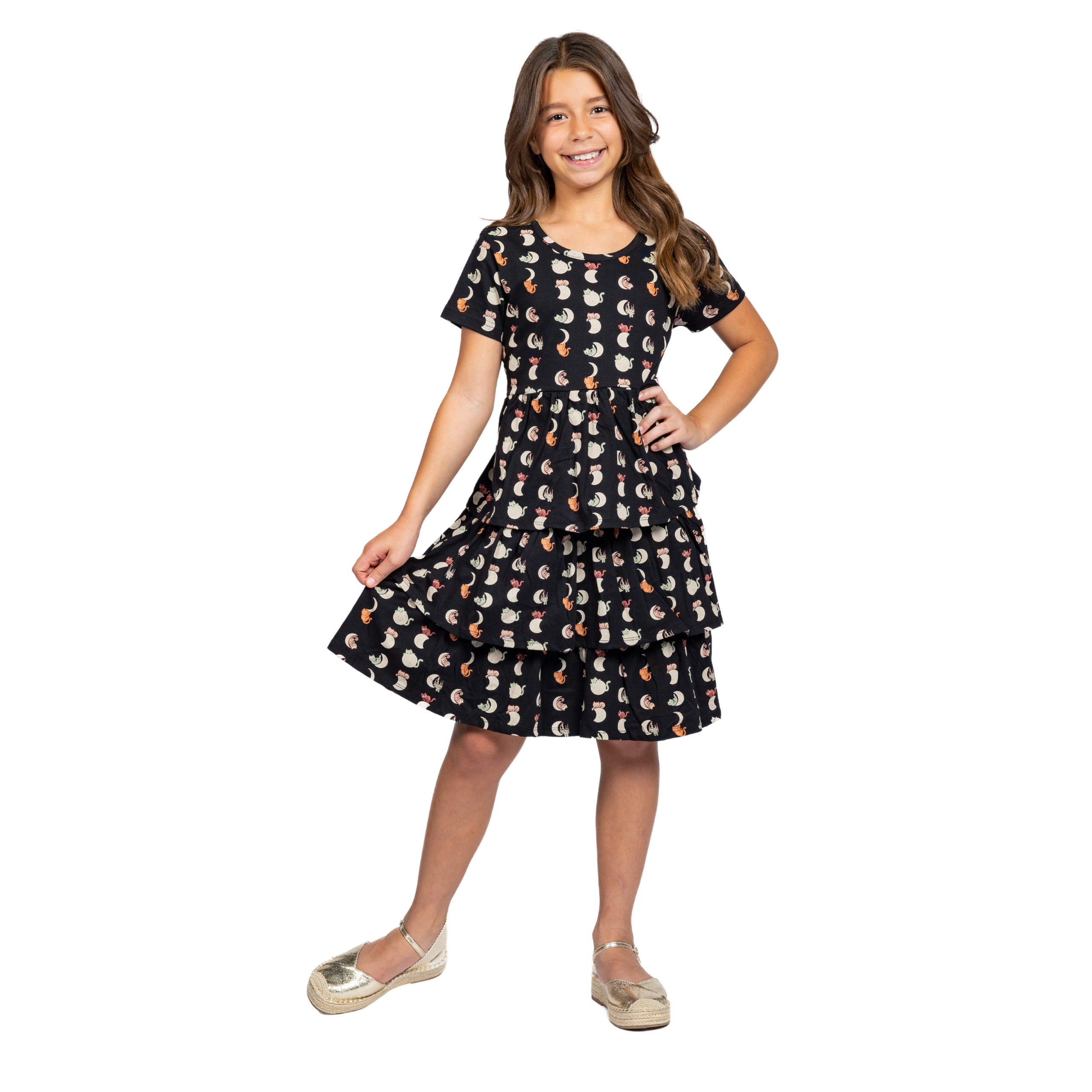 Introducing our "Lunar Kitty Kids Dress" - where feline grace meets celestial charm! This dress features an enchanting design of playful cats hanging from different phases of the moon. But there's more to this dress than just their whimsical design; they're a celebration of cosmic curiosity and feline agility.