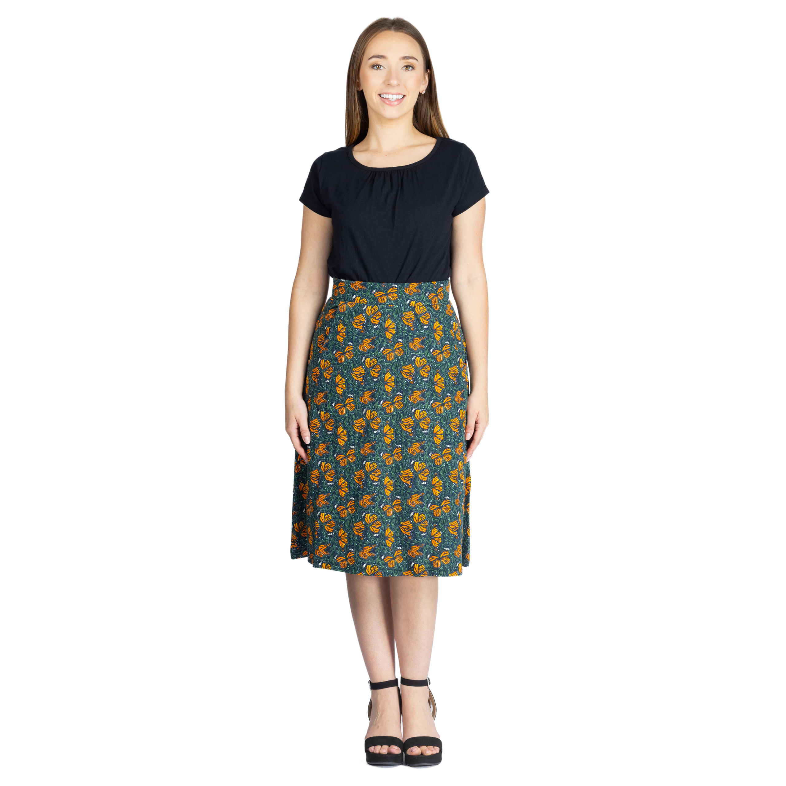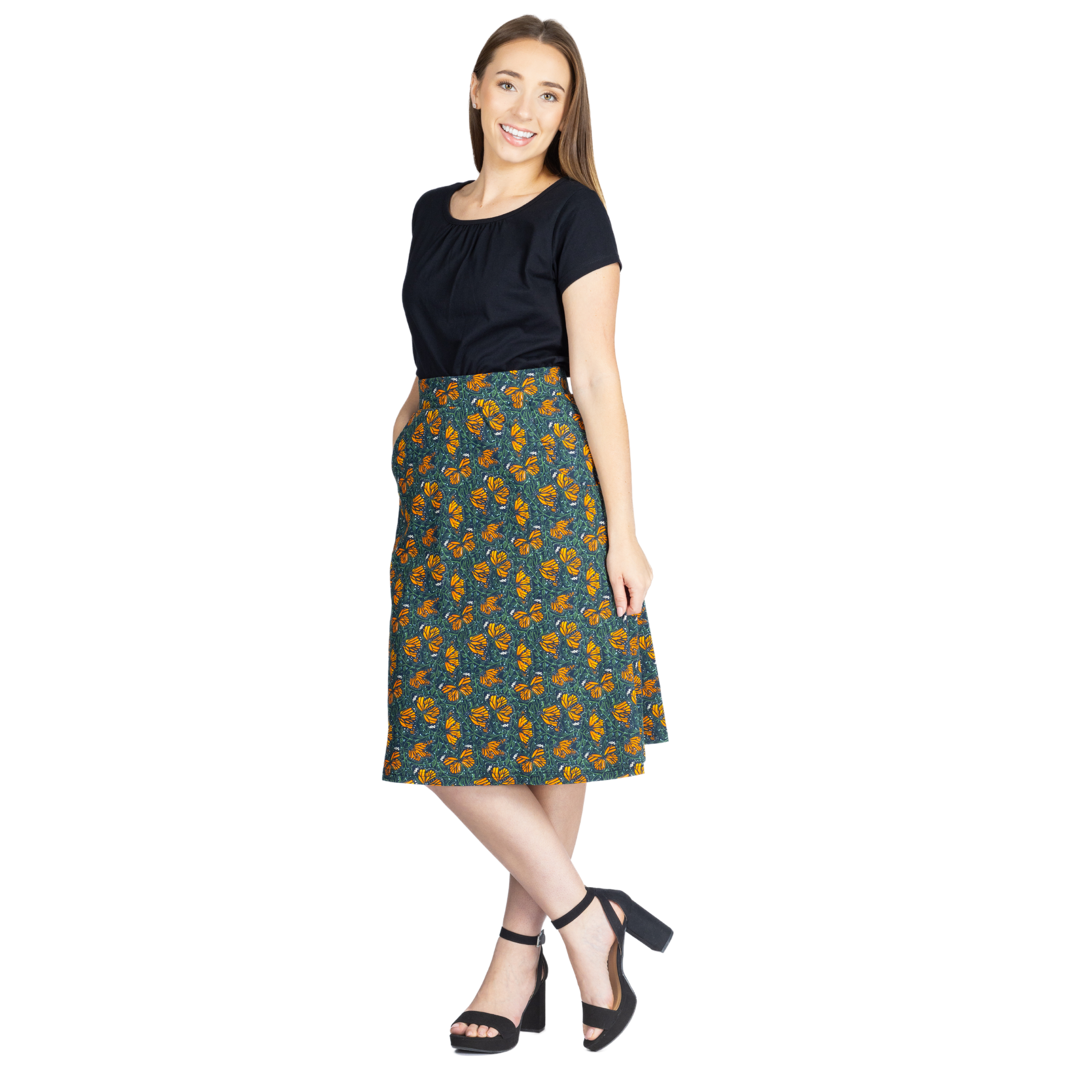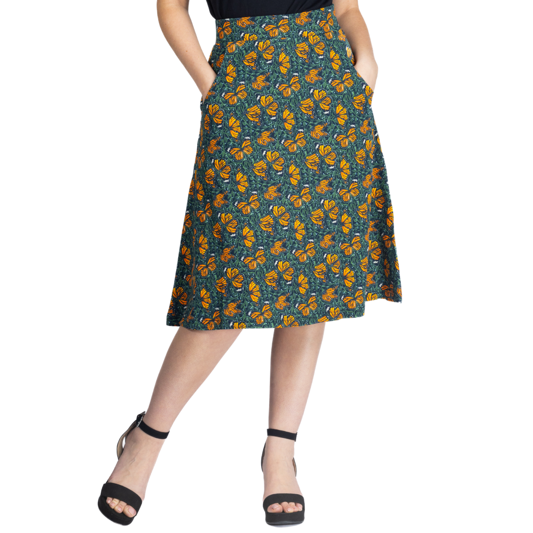 Monarch butterflies are incredible travelers! They embark on a remarkable migration journey each year, traveling up to 3,000 miles from their breeding grounds in North America to their wintering sites in central Mexico. This epic migration showcases their resilience and navigational skills! Featuring a stunning array of vibrant monarch butterflies gracefully fluttering across the fabric, this piece captures the essence of transformation and freedom. This skirt will have you feeling as light and graceful as a butterfly!