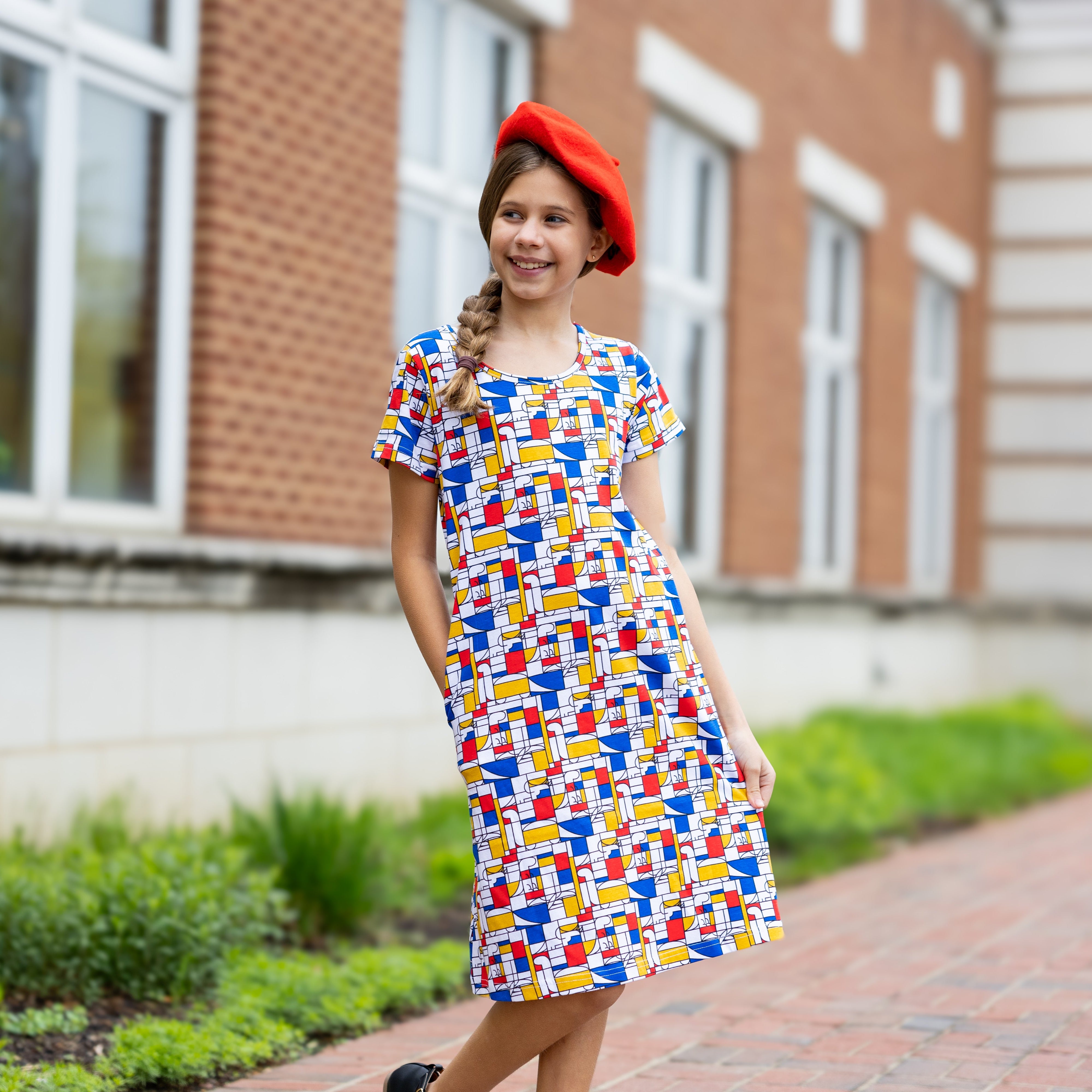 This dress fuses the bold color blocks of Mondrian’s iconic style with the charm of dinosaurs. Imagine raptors peeking through red rectangles, sauropods sashaying across sunny yellow, and triceratops outlined in sharp black grids. Because nothing says Jurassic class like a little abstract-asaurus!