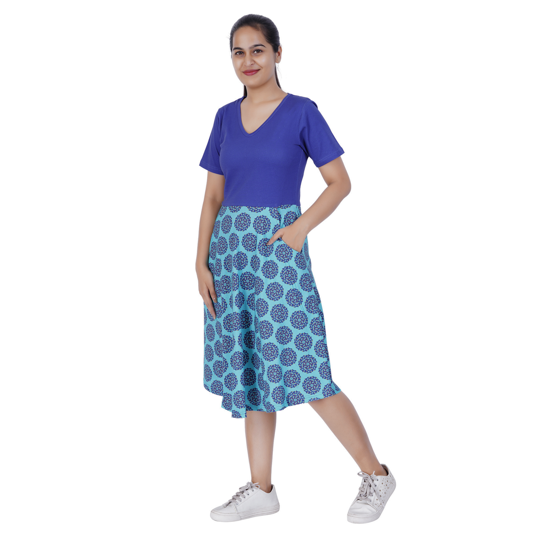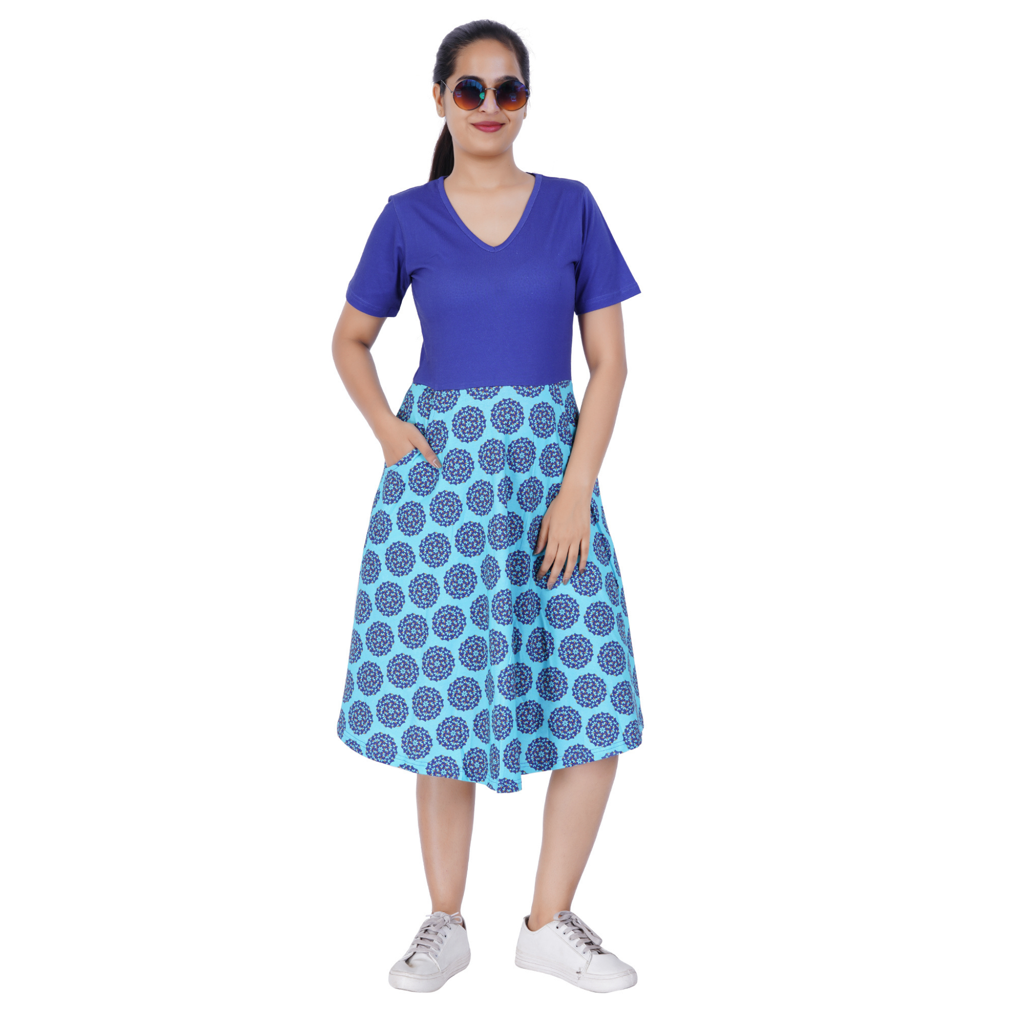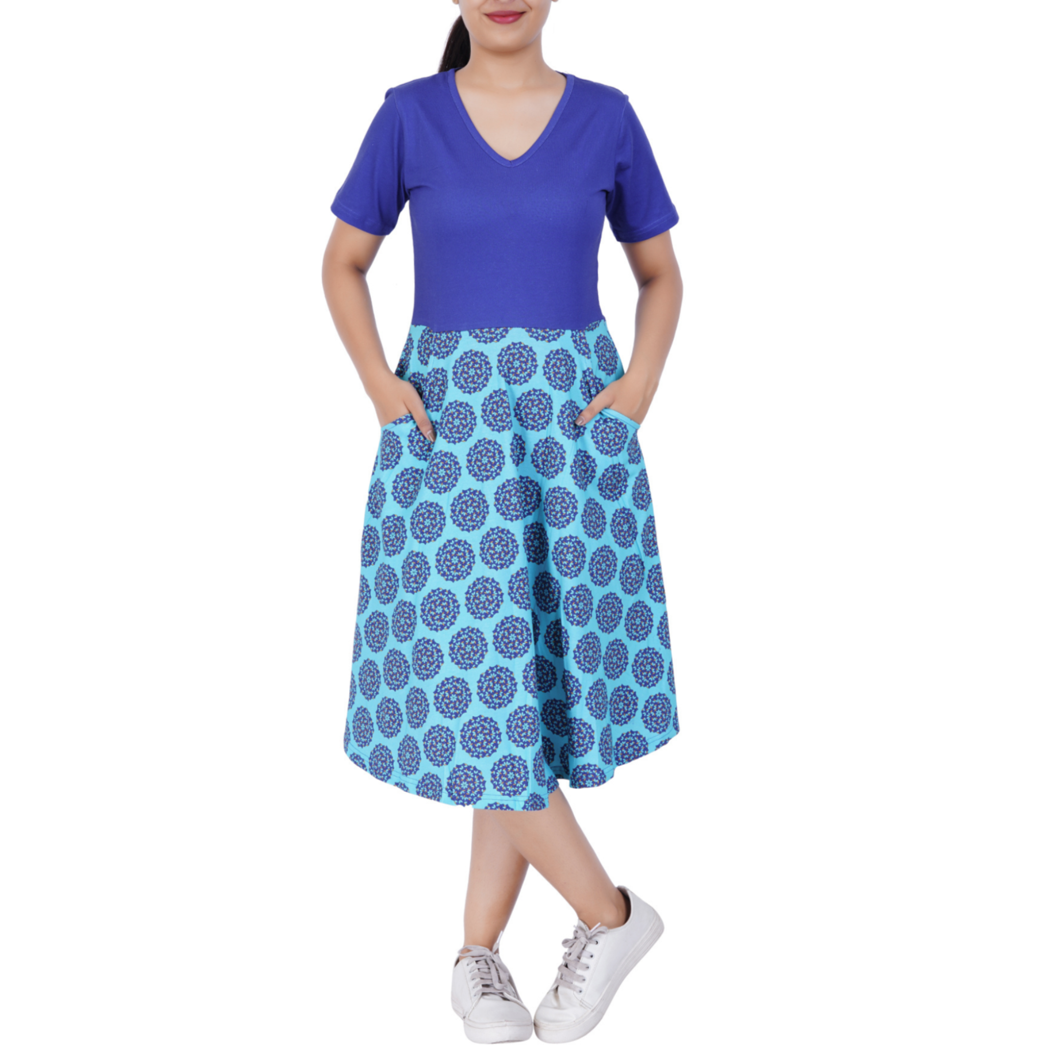 - Short sleeves, v-neck 1/2 circle adult fit & flare dress with pockets