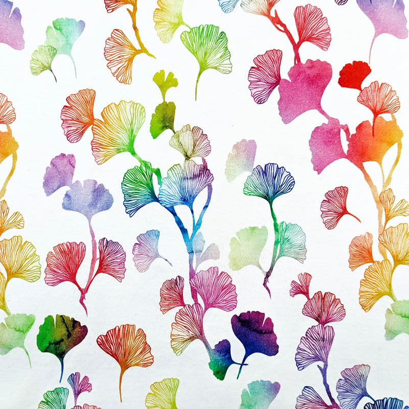 - Color: White with rainbow multicolored ginkgo leaves design