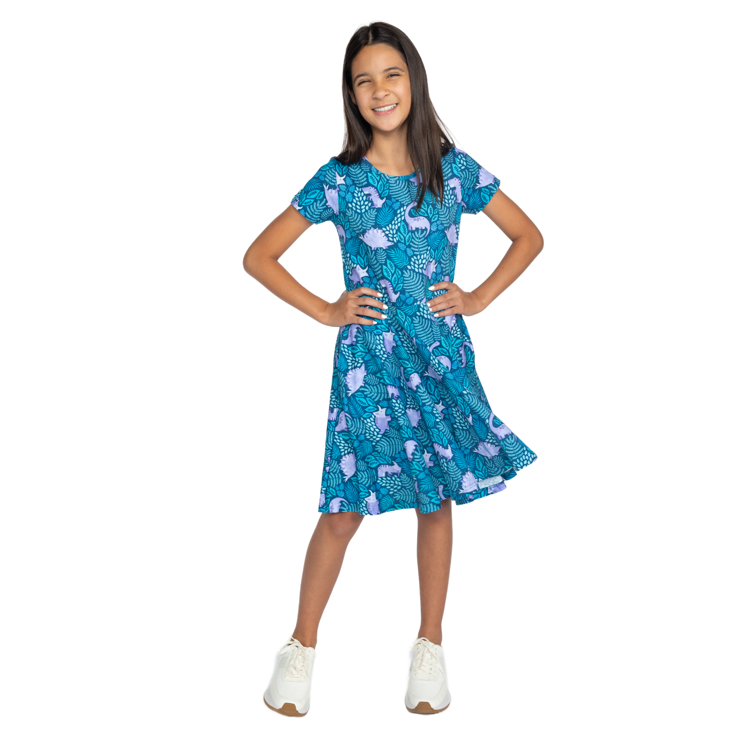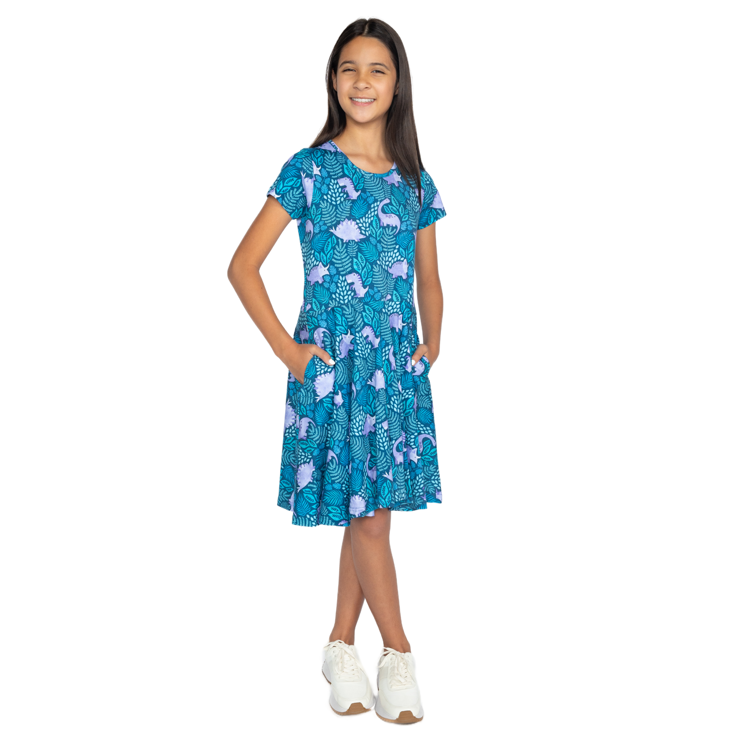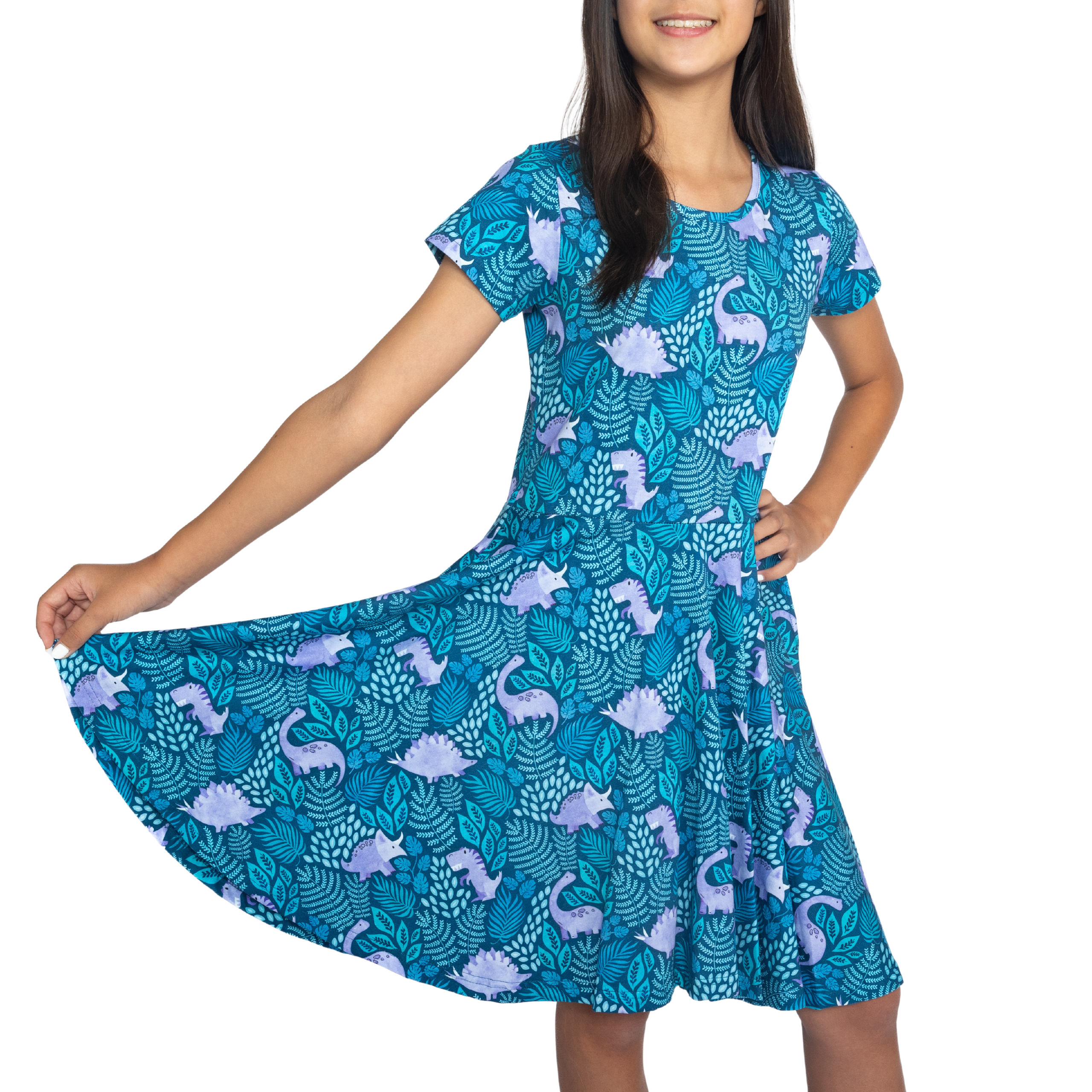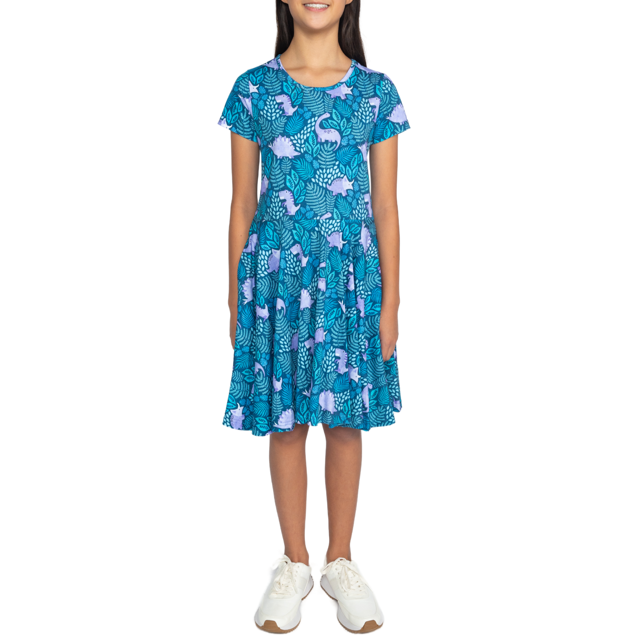 Unleash your inner adventurer and dive into this Tropical Dinosaur Dress! This vibrant and playful dress is perfect for adding a touch of prehistoric fun to your wardrobe. Featuring a whimsical print of purple dinosaurs frolicking amidst lush tropical foliage, this dress is sure to make you stand out from the crowd!