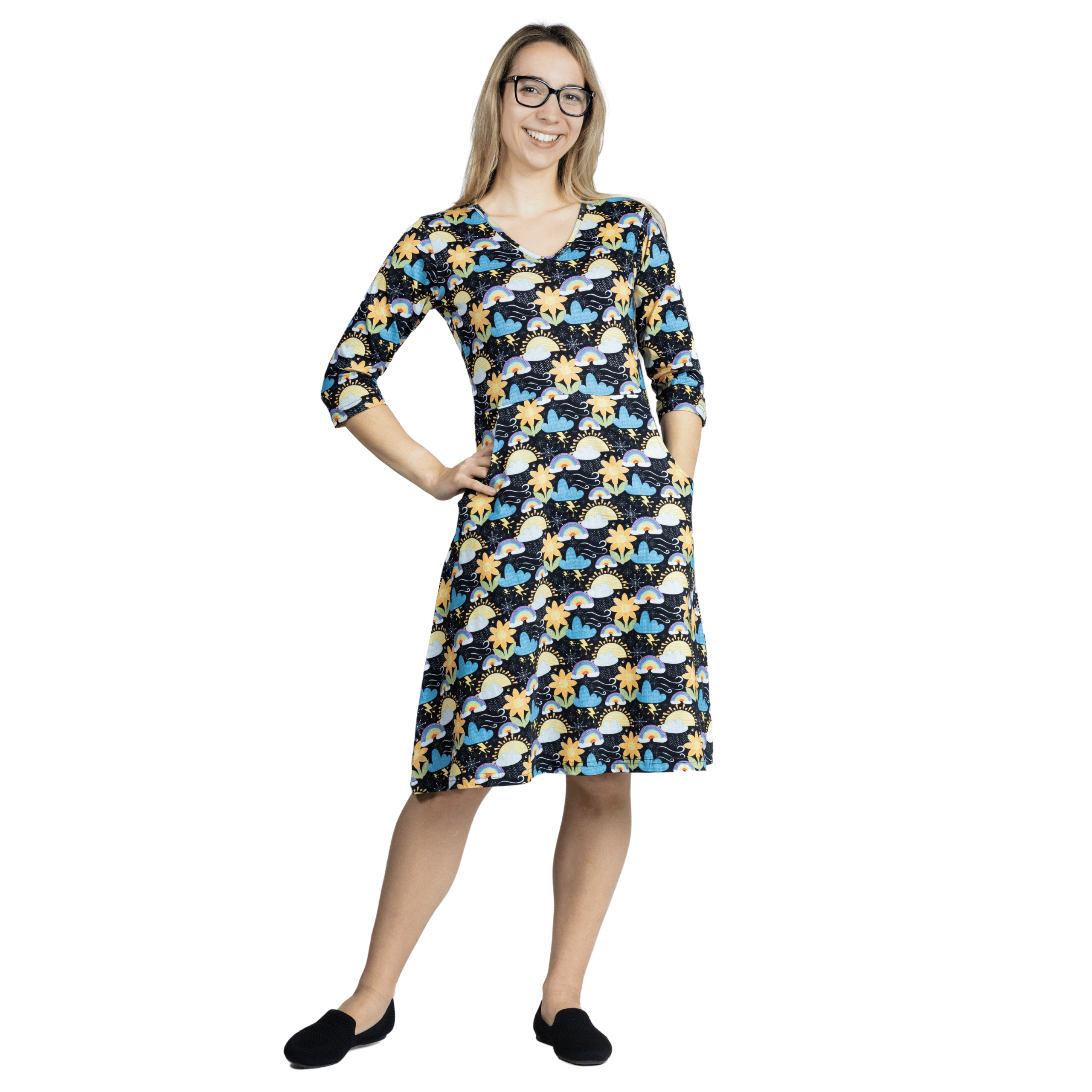 3/4th sleeve, Adults a-line dress with V-neck and functional pockets